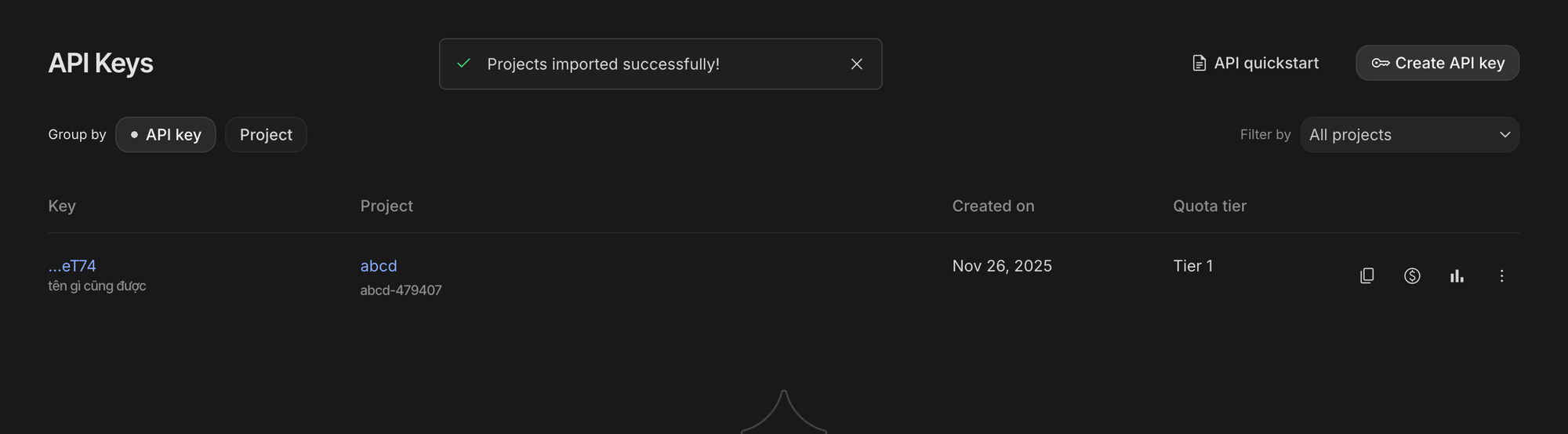 Như này là bạn đã có API Key để có thể Link nó khi muốn dùng Nano Banana Pro theo yêu cầu của Google. (Giá trị API Key của bạn sẽ khác trong ảnh của tôi, đừng máy móc quá, miễn sao có 1 dòng tương tự của tôi là được).