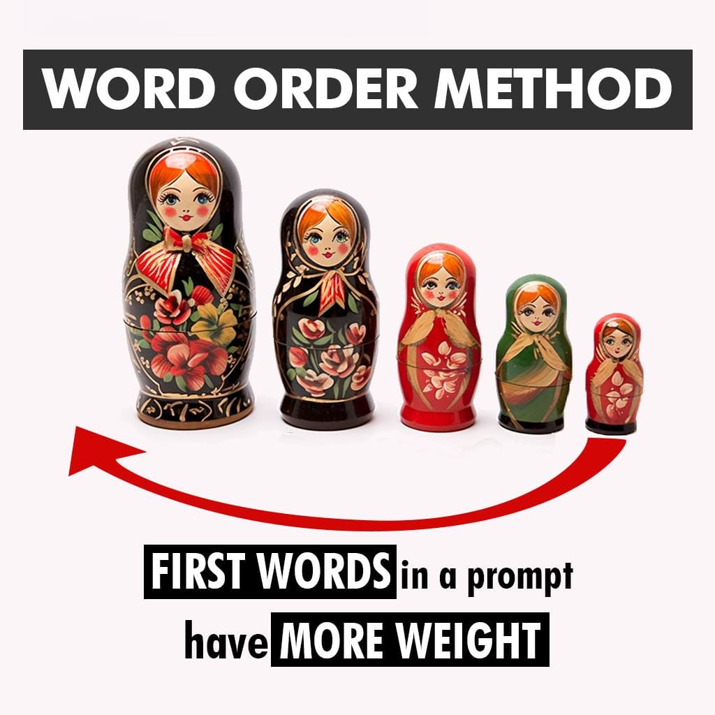 Ví dụ đơn giản với “táo, cam, nho, chuối”, táo sẽ có xu hướng nặng hơn và chuối ít hơn. Di chuyển chuối lên phía trước sẽ tạo thêm trọng lượng cho chuối và có thể có nhiều chuối hơn hoặc những quả chuối này có thể trông gần hơn, chiếm nhiều không gian trên màn hình hơn. Phương pháp này phù hợp với nội dung của hình ảnh (đối tượng, chủ thể, vị trí, bố cục) cũng như đối với phong cách hoặc đặc điểm cụ thể của một phong cách.