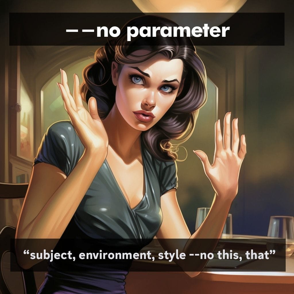 Câu lệnh --no là một cách nhanh chóng, đơn giản để loại bỏ những phần không mong muốn. Điều này có nghĩa là nếu bạn không muốn nhìn thấy nội dung nào đó trong hình ảnh, bạn có thể sử dụng tham số --no.