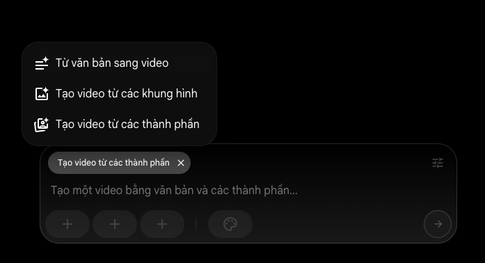 - Tạo video từ các thành phần chỉ tương thích với Veo 2 Quality, không tương thích với Veo 3 nên kết quả tạo ra sẽ câm như hến (chẳng có âm thanh gì cả). Nhưng đổi lại bạn có thể thả ảnh của các nhân vật, ảnh bối cảnh, ảnh đồ vật và nó sẽ tạo cảnh quay có tất cả những thứ đó theo mô tả của bạn -> thích hợp để làm video đồng nhất nhân vật.