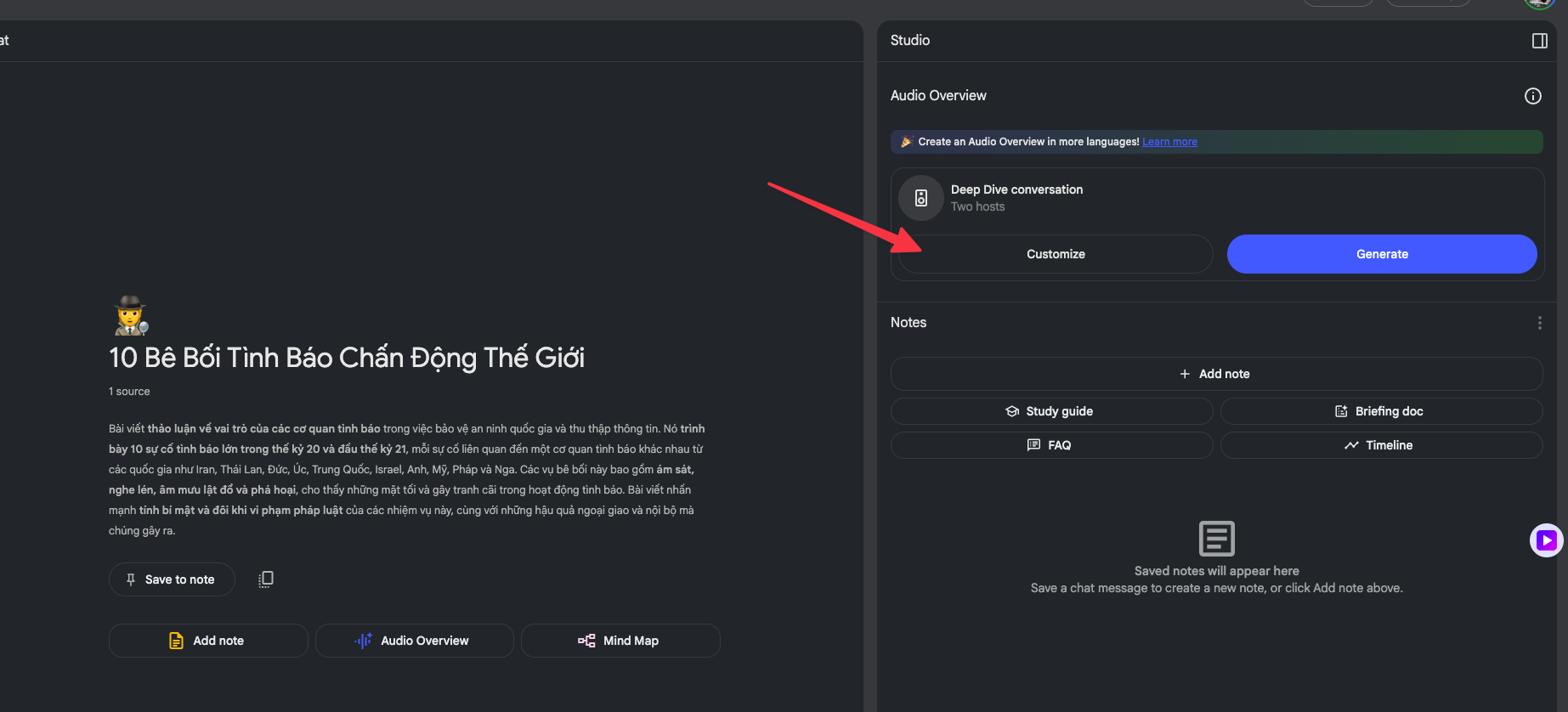 Ok. Để khống chế được cách NotebookLM tạo ra podcast, việc đầu tiên cần làm đó là phải bật được cái Customize trước khi nhấn tạo âm thanh.