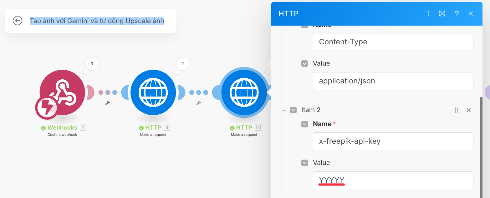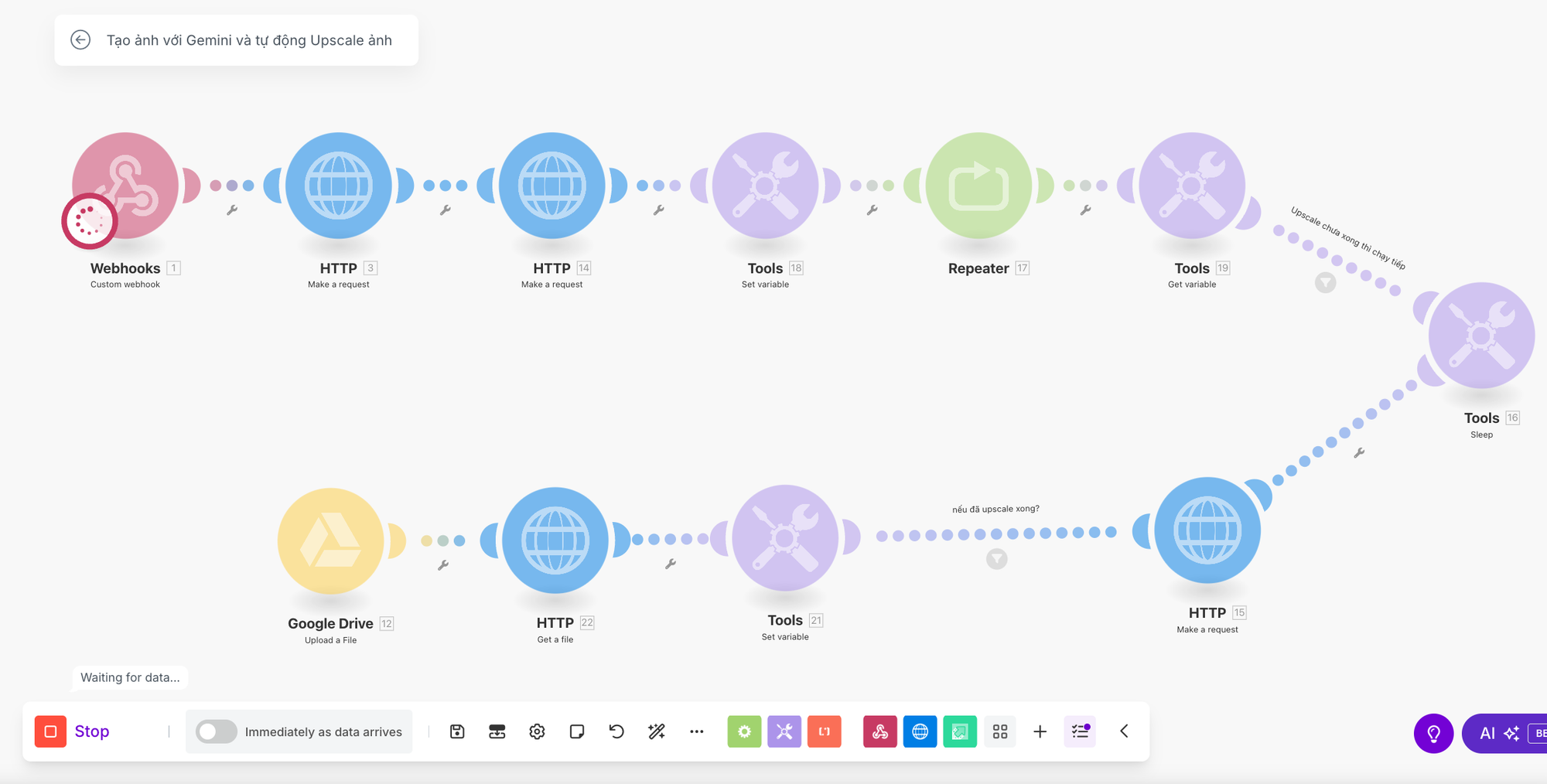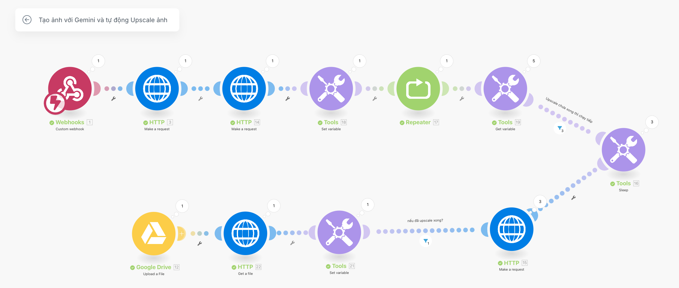 Workflow này dùng để Tạo ảnh trên Google Gemini và tự động Upscale ảnh để đảm bảo chất lượng hiển thị tốt nhất. Bạn có thể ứng dụng nó vào việc thiết kế hình ảnh, sản xuất nội dung, đăng bài hay làm video.